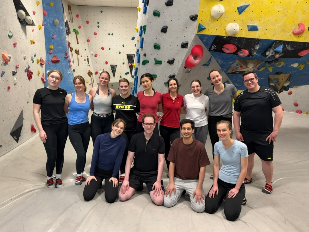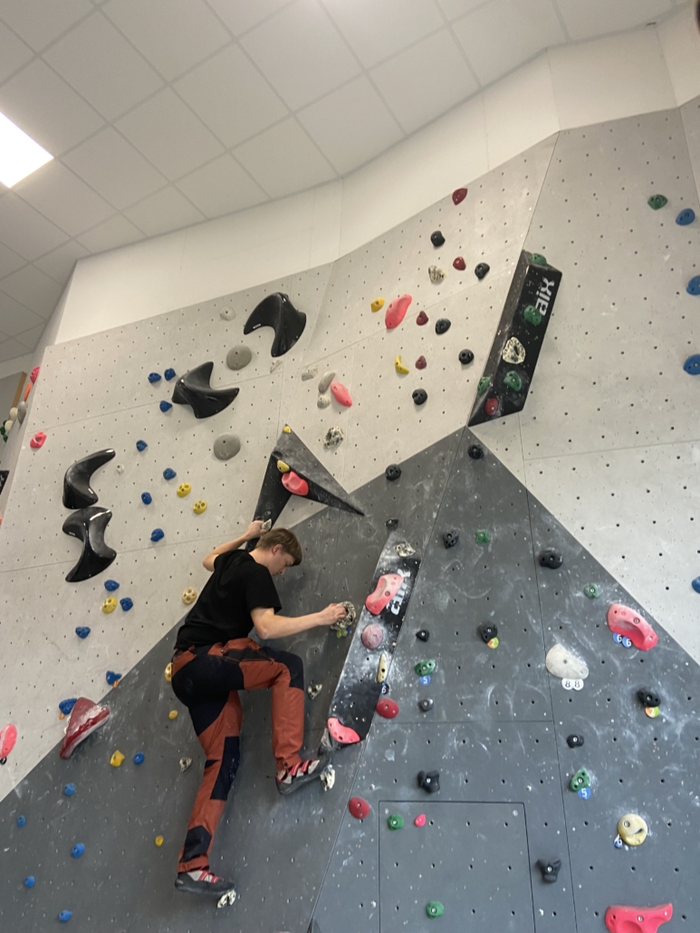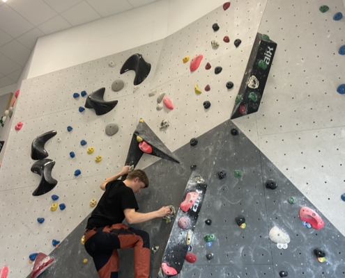 Von diesen mannigfaltigen Eindrücken geprägt, ging es für die Gruppe nach Deggendorf, wo sich zwischen Erlebnisbad und Klettererlebnis entschieden werden konnte. Die Einen genossen wellenjagend das Elypso Erlebnisbad, während es für die Anderen hoch hinaus ging. Im Kletterzentrum Deggendorf wurde voller Ambition eine Wand nach der Nächsten erobert. Begonnen wurde gemeinsam mit den einfacheren Boulder-Routen, die wir alle voller Spaß absolvierten. Doch schon bald erlosch das Boulder Fieber bei so einigen, um ihrem Wunsch nach noch Höherem nachgehen zu können. Mutig wurden auch die höchsten Wände erklommen. Als sich Stephan der Herausforderung einer anspruchsvollen Route stellte und mehrfach auf die Probe gestellt wurde, pflegte unsere weise Mitbewohnerin trefflich zu sagen „Wie ein Chihuahua in der Wade beißt er sich an der Wand fest“.