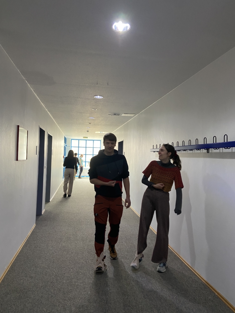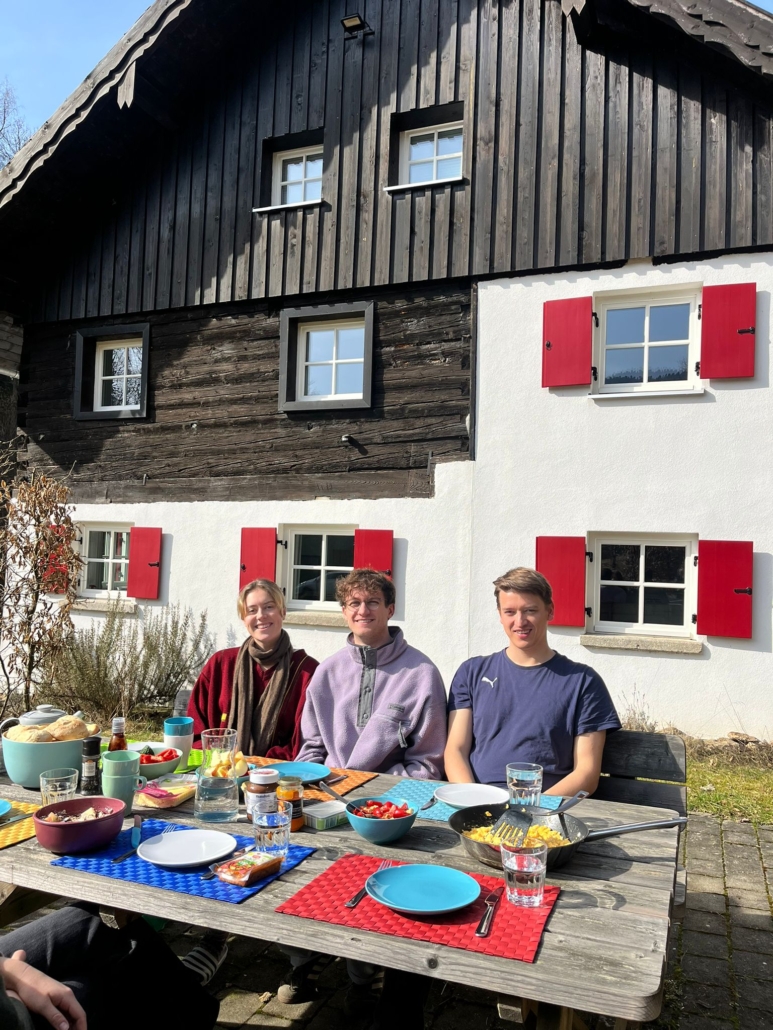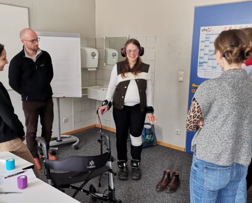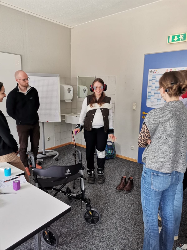 Nach einer intensiven Woche in den Praxen haben wir am Samstag die Chance genutzt und ausgeschlafen. Der Duft von Kaffee hat uns morgens alle in die Küche zum gemeinsamen Frühstück angezogen. Gestärkt machten wir uns auf den Weg nach Regen zu einem interdisziplinären Vormittag. Ärzte/-innen, Physiotherapeutinnen, Ergotherapeutinnen und medizinische Fachangestellte haben gemeinsam ein Teaching zum Umgang mit geriatrischen Patienten/-innen gestaltet. Dort konnten wir mit kleinen Tricks selbst ausprobieren, welche Hilfsmittel beispielsweise Parkinsonpatienten/-innen nutzen können. Zusammen mit den Ergotherapeutinnen haben wir uns kurzzeitig altern lassen und die Herausforderungen erlebt, vor denen alte Menschen stehen. Mit dem „Altersanzug“ haben wir die Tücken von Altersschwerhörigkeit, Arthrose und Co. am eigenen Körper erlebt. Zurück im Hier und Jetzt haben wir die Besonderheiten der Medikamentenverordnung bei älteren Patienten/-innen besprochen und konnten viel über die hausärztliche Herangehensweise mitnehmen.
